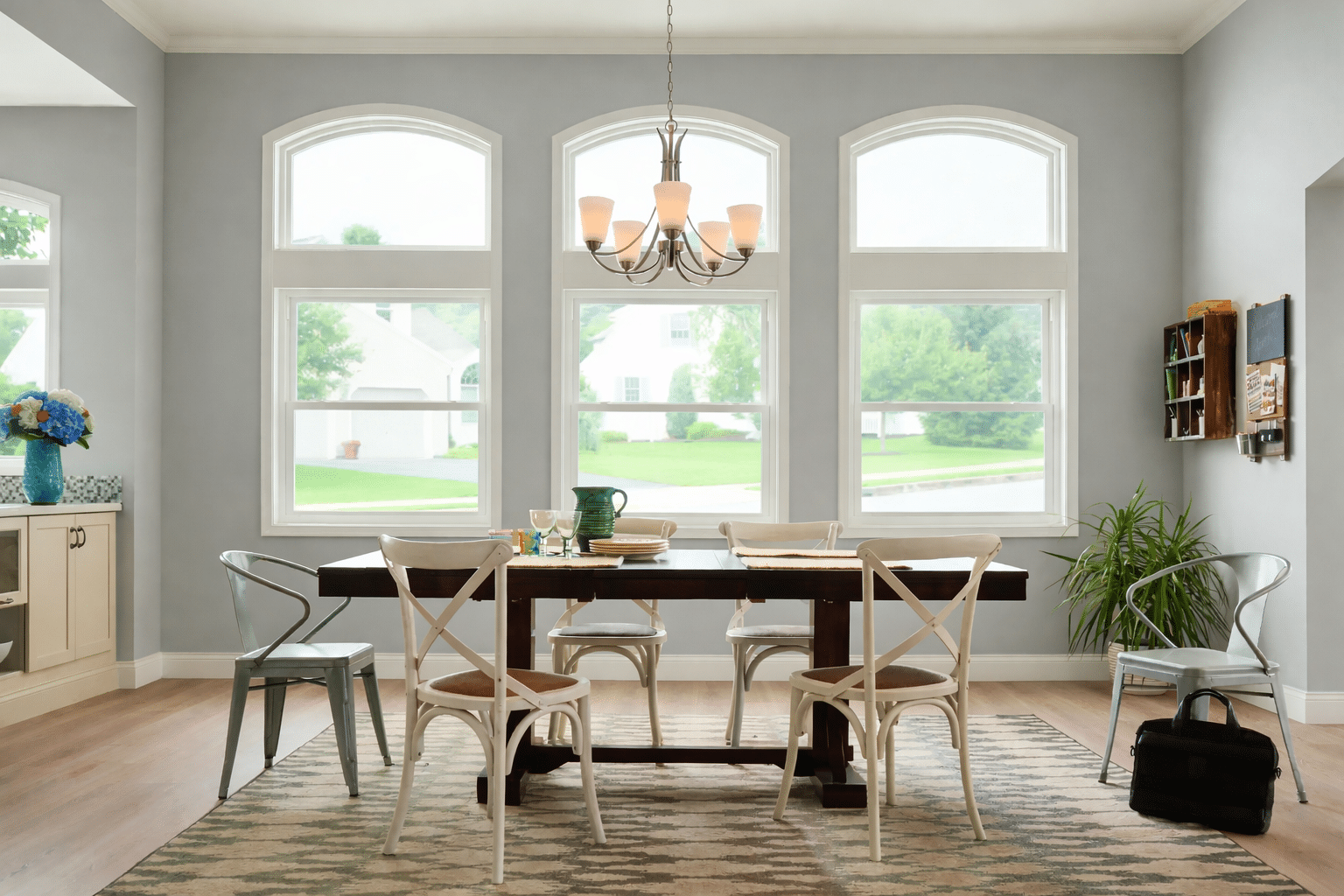 - Fixed-glass, geometric-shaped windows enhance architectural appeal